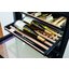 Встраиваемые холодильники для вина оснащаются специальной системой вентиляции: охлаждающая система у них находится в нижней части корпуса спереди. На такие устройства не навешивается мебельный фасад: дверца с затемненным стеклом остается на виду и открывается на достаточно широкий угол для свободного выдвижения деревянных полок.