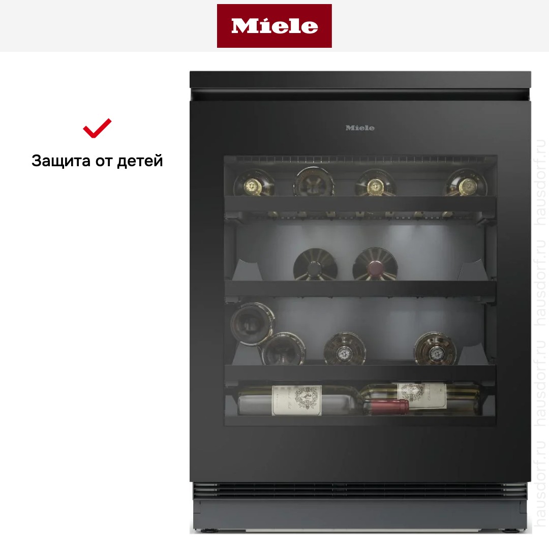 Винный холодильник Miele KWTUS 7054 F имеет одну температурную зону, в которой можно разместить бутылки и единовременно выставить только одну комбинацию настроек. Он встраивается в нишу, что удобно, если у вас ограничен метраж помещения. Благодаря компактным размерам данная модель — отличный выбор для офиса, гостиничного номера. Количество бутылок, которое можно разместить с учетом полной комплектации и из расчета объема бутылки 0,75 л, — 44 шт.