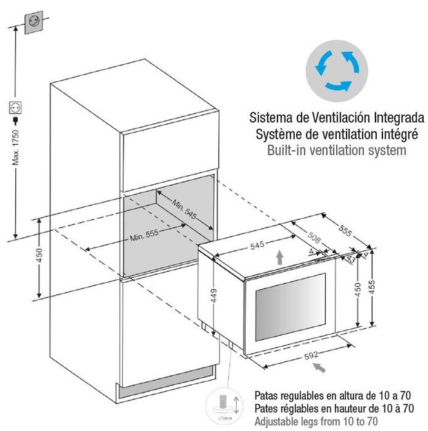 Некоторые отдельно стоящие винные шкафы, а также модели, встраиваемые в мебельную колонну, шкаф или другое закрытое пространство, оснащаются системой забора воздуха и вентиляционной решеткой, расположенными спереди в нижней части корпуса. Зазоры между корпусом шкафа и стенками мебели необходимы и в этом случае.