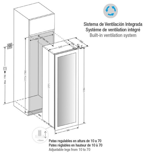 Некоторые отдельно стоящие винные шкафы, а также модели, встраиваемые в мебельную колонну, шкаф или другое закрытое пространство, оснащаются системой забора воздуха и вентиляционной решеткой, расположенными спереди в нижней части корпуса. Зазоры между корпусом шкафа и стенками мебели необходимы и в этом случае.