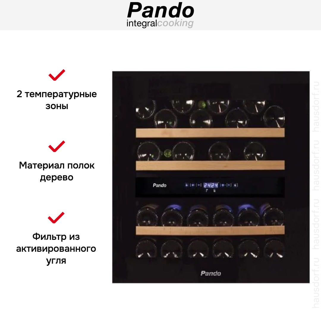 Винный холодильник Pando PVMAVP 60-23CRR W имеет две температурные зоны, в которых одновременно можно хранить разные сорта алкоголя и выставлять разные сочетания настроек. Он встраивается в нишу, что удобно, если у вас ограничен метраж помещения. Благодаря компактным размерам данная модель — отличный выбор для офиса, гостиничного номера. Количество бутылок, которое можно разместить с учетом полной комплектации и из расчета объема бутылки 0,75 л, — 23 шт.