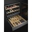 Встраиваемые холодильники для вина оснащаются специальной системой вентиляции: охлаждающая система у них находится в нижней части корпуса спереди. На такие устройства не навешивается мебельный фасад: дверца с затемненным стеклом остается на виду и открывается на достаточно широкий угол для свободного выдвижения деревянных полок.