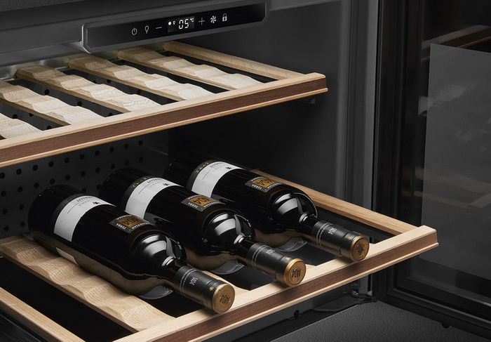 Встраиваемые холодильники для вина оснащаются специальной системой вентиляции: охлаждающая система у них находится в нижней части корпуса спереди. На такие устройства не навешивается мебельный фасад: дверца с затемненным стеклом остается на виду и открывается на достаточно широкий угол для свободного выдвижения деревянных полок.