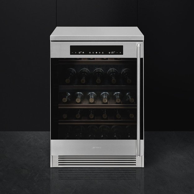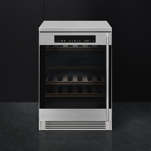 Smeg CVF338XS — двухтемпературный винный шкаф в корпусе из нержавеющей стали. Модель оборудована сенсорной панелью управления c информативным LED-дисплеем. Угольный фильтр препятствует распространению неприятных запахов по внутрикамерному пространству.