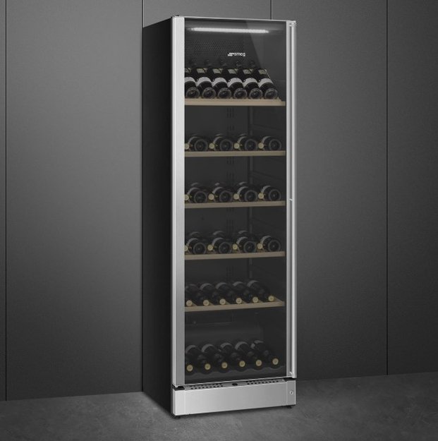 Винный холодильник Smeg SCV115GS имеет две температурные зоны, в которых одновременно можно хранить разные сорта алкоголя и выставлять разные сочетания настроек. Он устанавливается отдельно, что удобно, если у вас есть специальное помещение — кладовая, погреб и т.д. Количество бутылок, которое можно разместить с учетом полной комплектации и из расчета объема бутылки 0,75 л, — 197 шт.