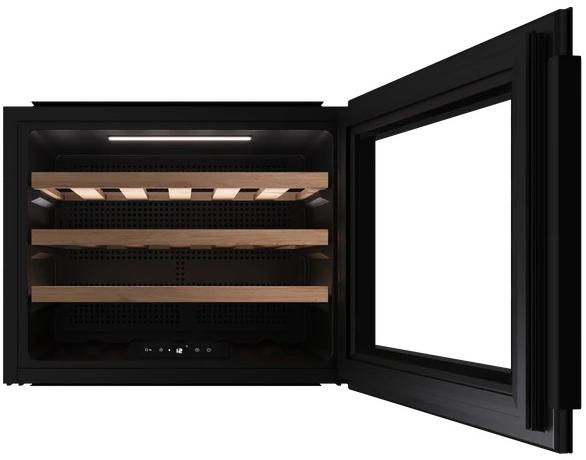 Встраиваемые холодильники для вина оснащаются специальной системой вентиляции: охлаждающая система у них находится в нижней части корпуса спереди. На такие устройства не навешивается мебельный фасад: дверца с затемненным стеклом остается на виду и открывается на достаточно широкий угол для свободного выдвижения деревянных полок.