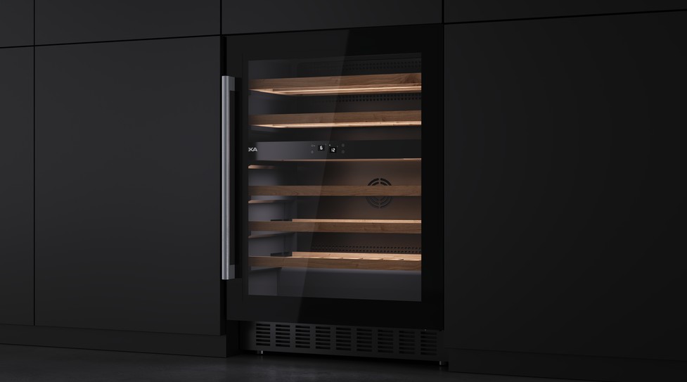 Встраиваемые холодильники для вина оснащаются специальной системой вентиляции: охлаждающая система у них находится в нижней части корпуса спереди. На такие устройства не навешивается мебельный фасад: дверца с затемненным стеклом остается на виду и открывается на достаточно широкий угол для свободного выдвижения деревянных полок.
