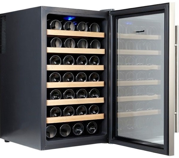 Шкаф с температурной зоной 12-18 градусов подходит для хранения красных и белых вин. Вы можете настраивать параметры благодаря электронному управлению и удобному дисплею на двери. В камере помещается до 28 бутылок — всего 6 деревянных полок. Эта модель будет спасением для начинающего коллекционера.