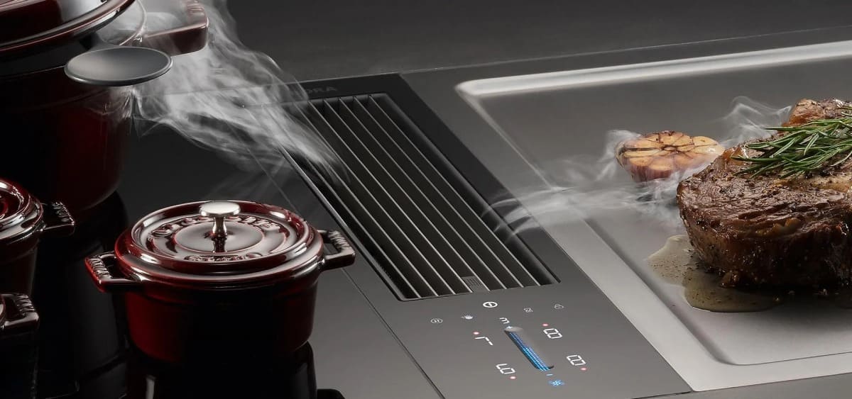 Вытяжки, встраиваемые в столешницу — эффективная инновация, которая подойдет для установки в кухне любой площади. Такие вытяжки размещаются за варочной поверхностью или рядом с ней. В отключенном состоянии всасывающая панель находится под столешницей, но после включения одной или нескольких конфорок она автоматически выдвигается при помощи специального лифтового механизма. Загрязненный воздух улавливается, не успевая распространиться по помещению. Когда вытяжка убрана, на виду остается только сенсорная панель управления. Недостатком подобных моделей является только сравнительно высокая цена.