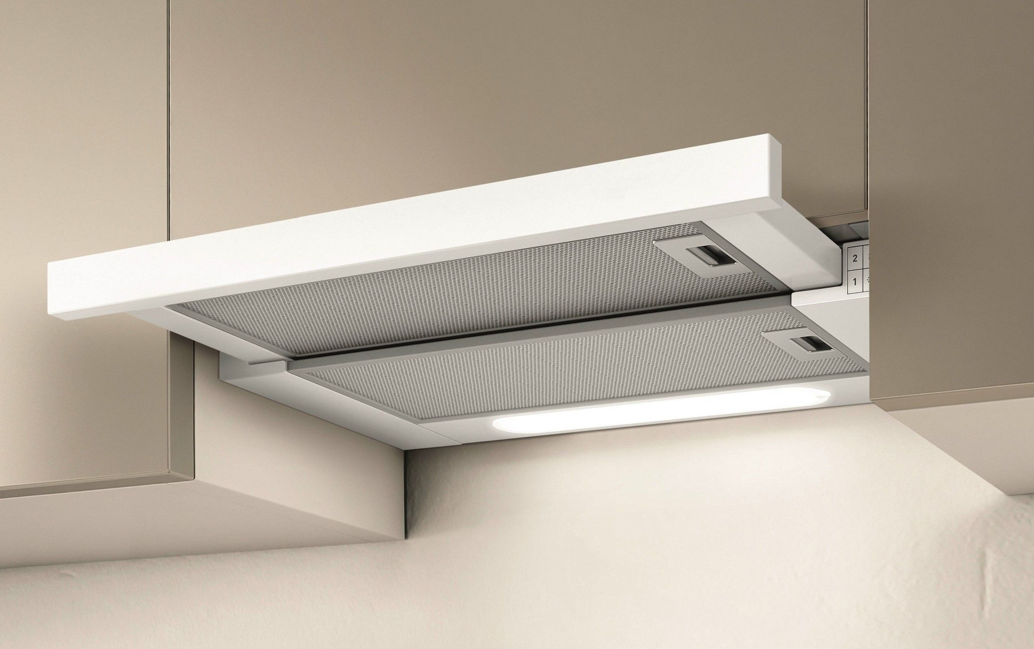 Вытяжка с выдвижным экраном белого цвета идеально подходит современному интерьеру в светлых тонах. Выбирайте один из трех уровней мощности в зависимости от степени загрязнения воздуха.