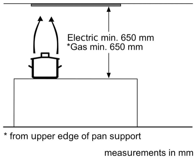 Стандартное расстояние между встраиваемыми или купольными вытяжками и варочной поверхностью должно составлять 65–75 см для электрических и индукционных варочных панелей, и 75–85 см для газовых плит. Для популярных наклонных моделей расстояние от их нижнего края до варочной поверхности может быть уменьшено до 35–45 см для электрических и индукционных устройств и до 55–65 см для газовых.
