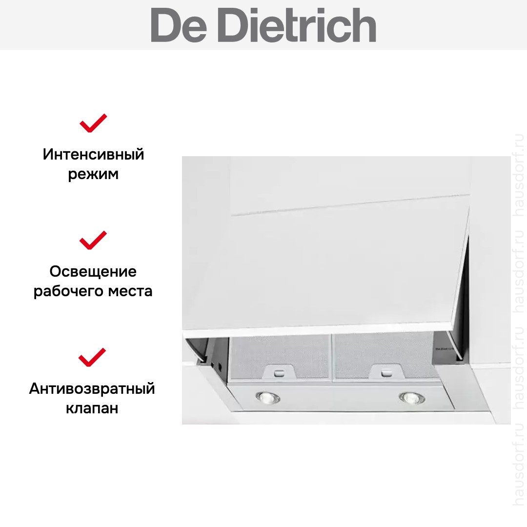 Встраиваемая вытяжка — выбор тех, кто хочет максимально задекорировать технику, или владельцев маленькой кухни. Тип встраивания: в шкаф. Обратите внимание на цветовые сочетания модели De Dietrich DHE1146A, чтобы органично вписать ее в свою квартиру. Оттенок корпуса: нержавеющая сталь. Благодаря лампочкам, которые расположены на нем, можно освещать плиту и столешницу рядом, чтобы готовить было еще проще и приятнее.