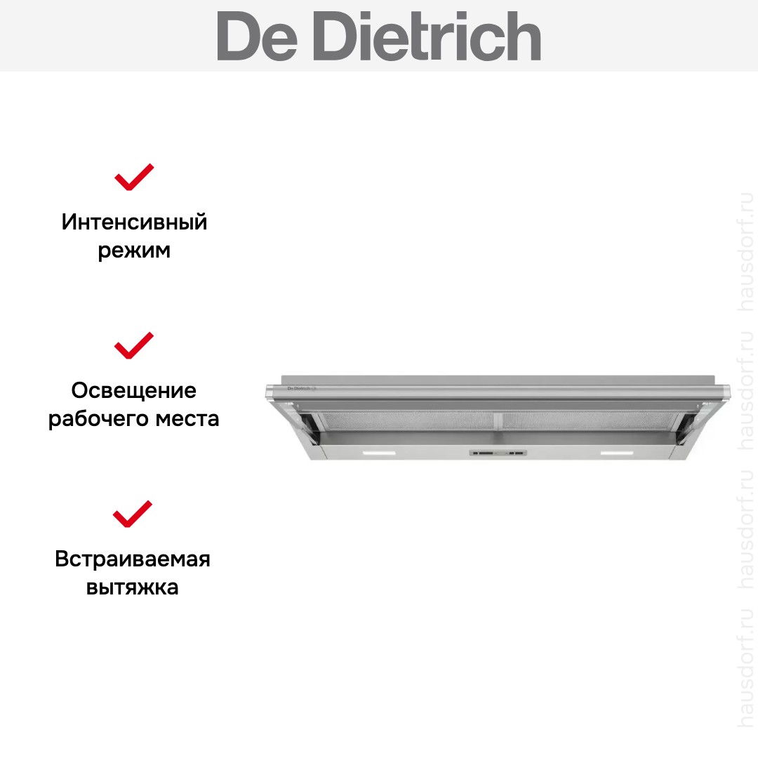 Встраиваемая вытяжка — выбор тех, кто хочет максимально задекорировать технику, или владельцев маленькой кухни. Тип встраивания: в шкаф. Обратите внимание на цветовые сочетания модели De Dietrich DHT3922X, чтобы органично вписать ее в свою квартиру. Оттенок корпуса: нержавеющая сталь. Благодаря лампочкам, которые расположены на нем, можно освещать плиту и столешницу рядом, чтобы готовить было еще проще и приятнее.