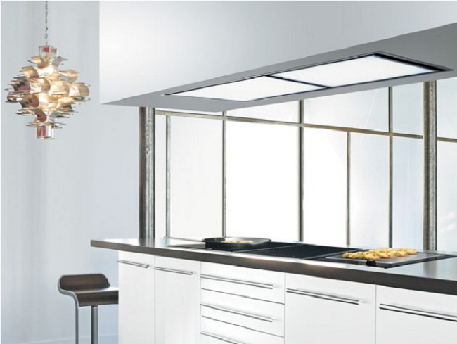 Вытяжка, встраиваемая в потолок, часто устанавливается над кухонным островом в просторной кухне и отличается достаточно высокой мощностью: она может работать как в режиме рециркуляции, так и в режиме отвода, так как воздуховод также скрыт в потолке. Вытяжки могут монтироваться в подвесной потолок либо устанавливаться в специальные многоярусные конструкции из гипсокартона непосредственно во время ремонта кухни. Для управления ими используется пульт ДУ.