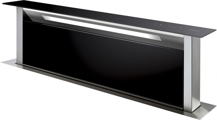 Вытяжки, встраиваемые в столешницу — эффективная инновация, которая подойдет для установки в кухне любой площади. Такие вытяжки размещаются за варочной поверхностью или рядом с ней. В отключенном состоянии всасывающая панель находится под столешницей, но после включения одной или нескольких конфорок она автоматически выдвигается при помощи специального лифтового механизма. Загрязненный воздух улавливается, не успевая распространиться по помещению. Когда вытяжка убрана, на виду остается только сенсорная панель управления. Недостатком подобных моделей является только сравнительно высокая цена.