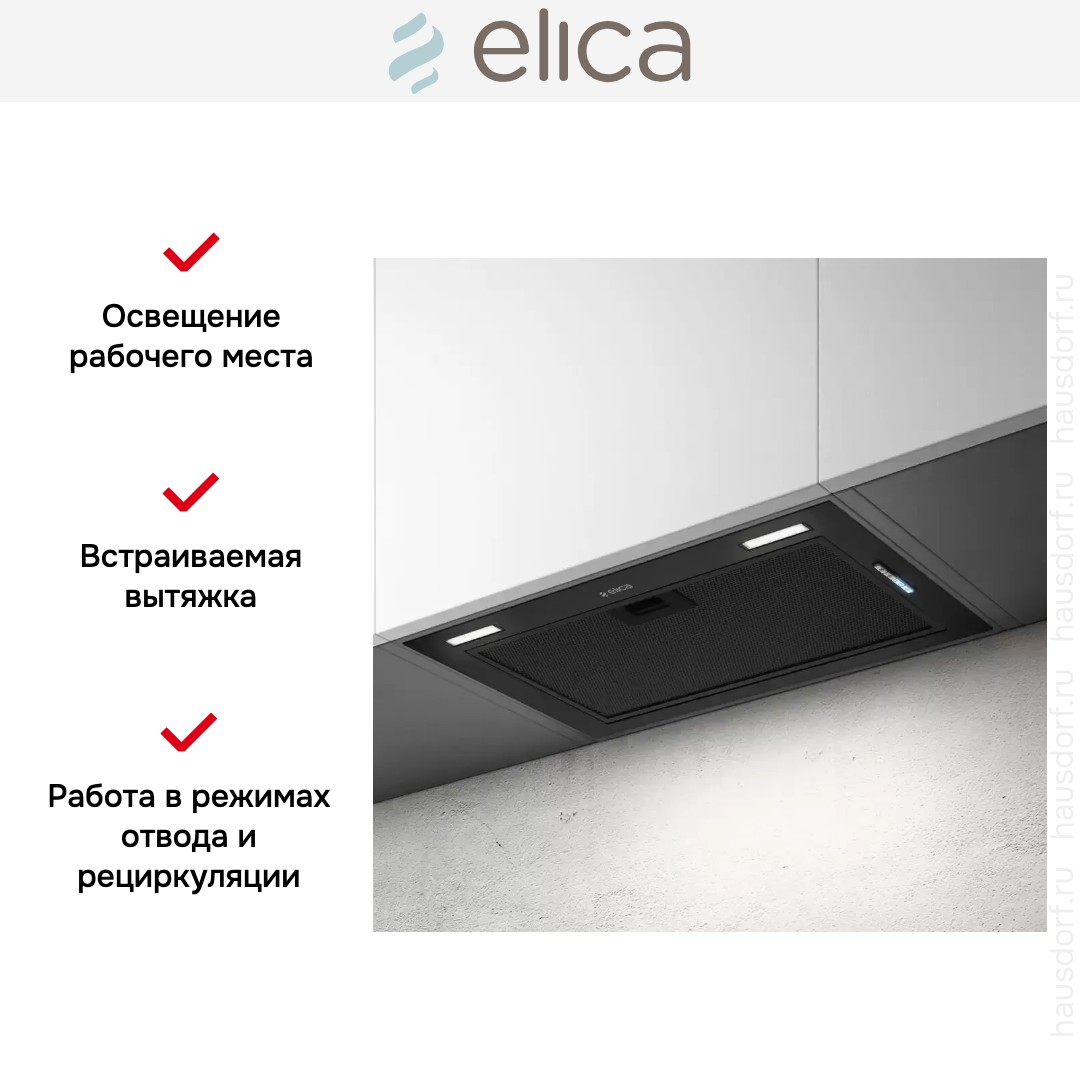 Встраиваемая вытяжка — выбор тех, кто хочет максимально задекорировать технику, или владельцев маленькой кухни. Тип встраивания: в шкаф. Обратите внимание на цветовые сочетания модели Elica FOLD BL MAT/A/52, чтобы органично вписать ее в свою квартиру. Оттенок корпуса: черный. Благодаря лампочкам, которые расположены на нем, можно освещать плиту и столешницу рядом, чтобы готовить было еще проще и приятнее.