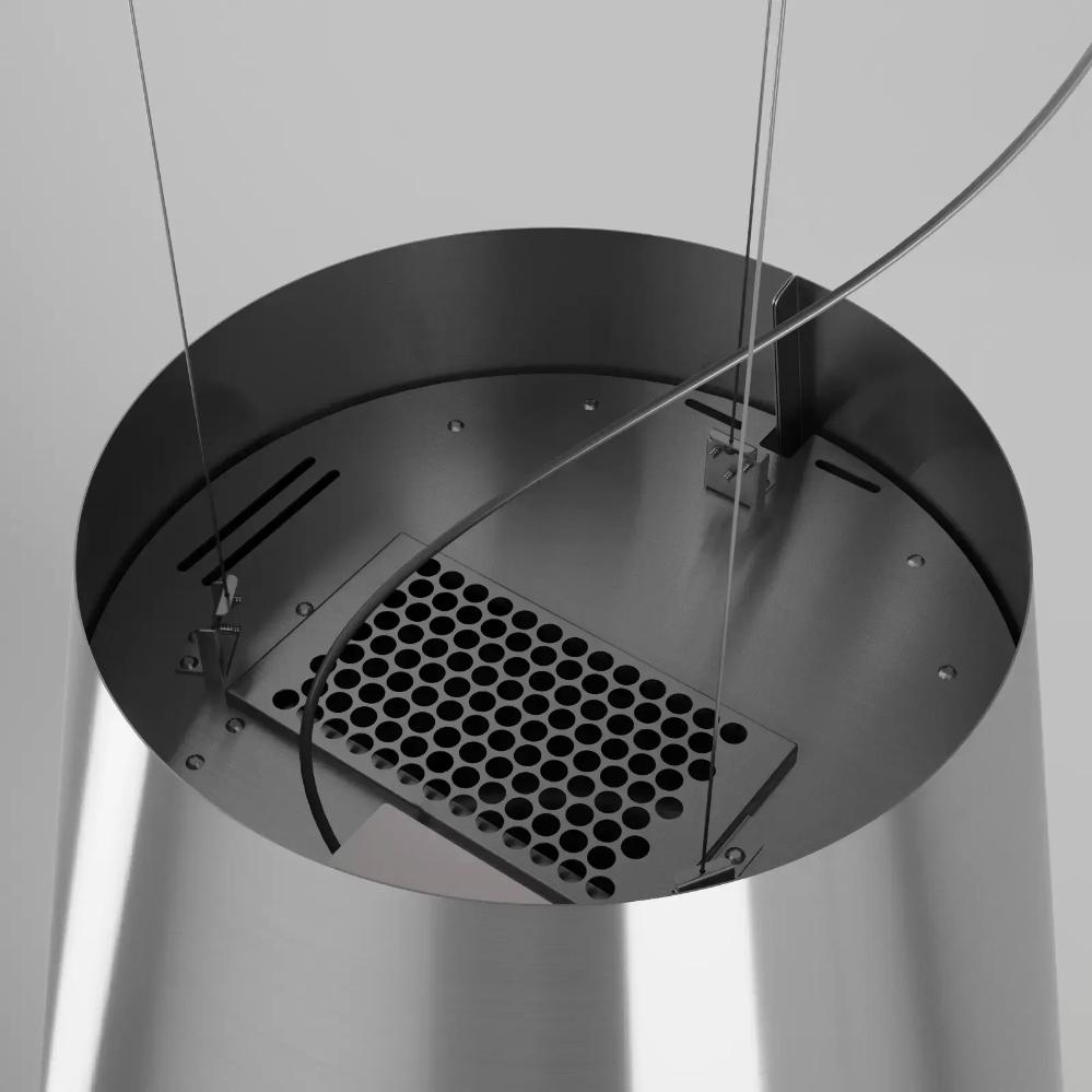 Модель крепится к потолку на специальные подвесу, которые можно отрегулировать по высоте. Подводов трубы не требуется, так как прибор работает в режиме циркуляции. Очистка воздуха происходит при помощи сменного угольного фильтра. Благодаря специальной пористой структуре нежелательные запахи и испарения быстро поглощаются, а в помещение возвращается очищенный поток. В основании модели предусмотрен жироулавливающий фильтр, который не позволяет частицам жира и пыли оседать на поверхности двигателя. Производитель рекомендует обязательно производить обслуживание прибора, так как от этого зависит эффективность очистки. Помогает следить за состоянием системы специальная индикация.