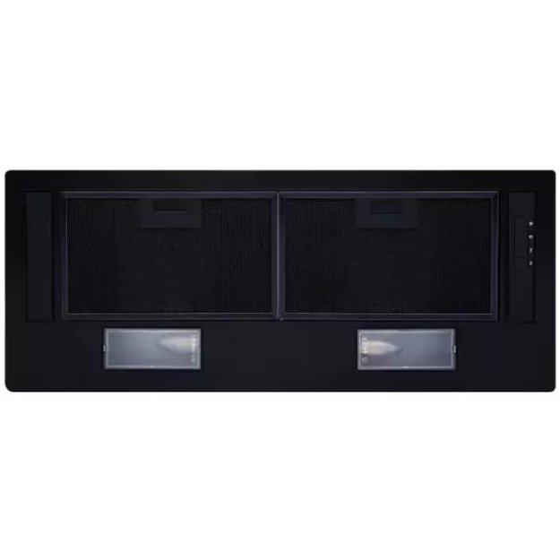 Встраиваемая вытяжка в черном исполнении оснащена мощным мотором, который обеспечивает качественную очистку помещения от загрязненного воздуха. Преимущество модели в том, что ее корпус спрятан за фасадом кухонного гарнитура. Прибор встраивается в навесной шкаф и видимым остается лишь основание черного цвета. Алюминиевый фильтр совпадает по оттенку с вытяжкой, что не выделяет его. Специальная сетка улавливает жир и другие возможные крупные загрязнения от попадания внутрь прибора и оседания на стенках воздухоотвода. Она легко снимается для обслуживания. Возможность мытья в посудомоечной машине экономит время и создает дополнительный комфорт.
