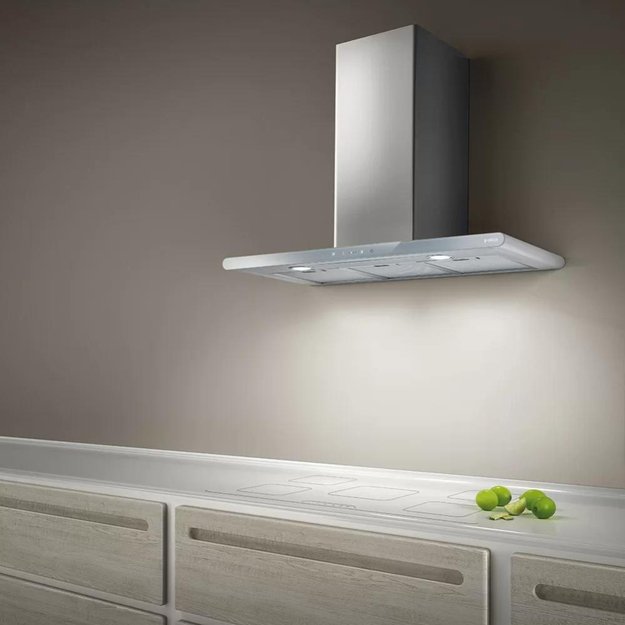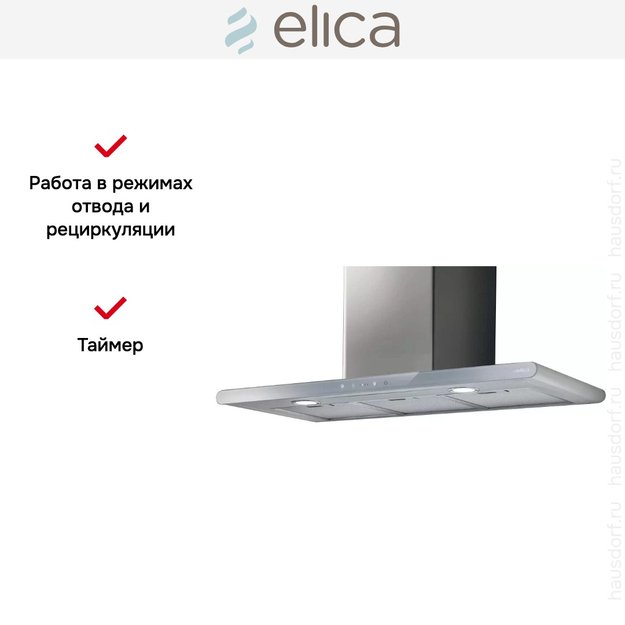 Красивая и современная вытяжка от бренда Elica отличается эффективной работой и низким уровнем шума при этом. Классический Т-образный дизайн дополнен округленными углами основания и сенсорной панелью управления, которое располагается на фронтальной части устройства. Каждая из кнопок оснащена сопутствующей графикой, активный элемент при этом подсвечивается — все это создает дополнительное удобство при внесении параметров.