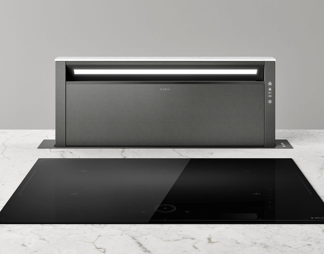 Вытяжки, встраиваемые в столешницу — эффективная инновация, которая подойдет для установки в кухне любой площади. Такие вытяжки размещаются за варочной поверхностью или рядом с ней. В отключенном состоянии всасывающая панель находится под столешницей, но после включения одной или нескольких конфорок она автоматически выдвигается при помощи специального лифтового механизма. Загрязненный воздух улавливается, не успевая распространиться по помещению. Когда вытяжка убрана, на виду остается только сенсорная панель управления. Недостатком подобных моделей является только сравнительно высокая цена.