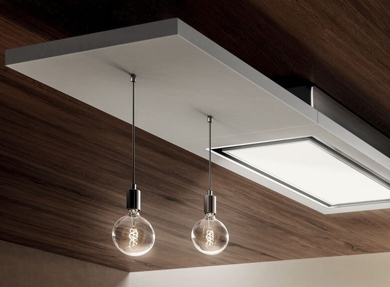 Вытяжка для потолочного монтажа — современное решение для кухонных интерьеров. Островные модели не нарушают дизайнерских решений, смотрятся стильно и гармонично. Сочетание металла и дерева подойдет как для классических решений, так и для дизайна в стиле прованс или рустик. Благодаря большой площади всасывания обеспечиваются быстрые и качественные результаты очистки кухни от загрязненного воздуха.