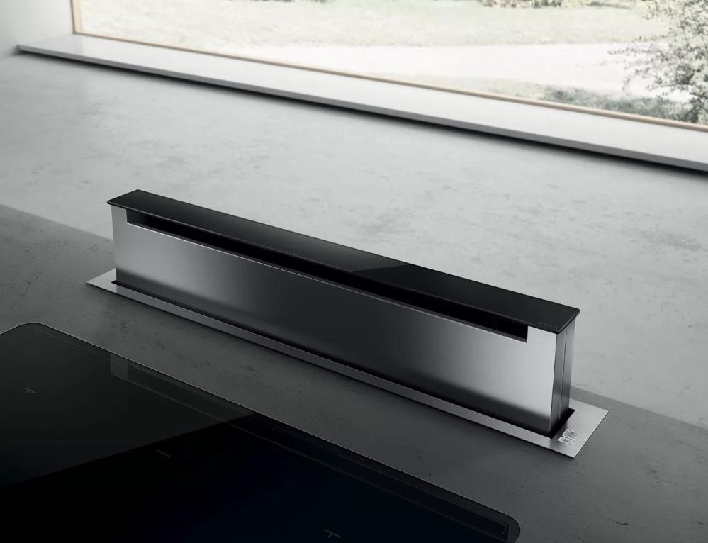 Вытяжки, встраиваемые в столешницу — эффективная инновация, которая подойдет для установки в кухне любой площади. Такие вытяжки размещаются за варочной поверхностью или рядом с ней. В отключенном состоянии всасывающая панель находится под столешницей, но после включения одной или нескольких конфорок она автоматически выдвигается при помощи специального лифтового механизма. Загрязненный воздух улавливается, не успевая распространиться по помещению. Когда вытяжка убрана, на виду остается только сенсорная панель управления. Недостатком подобных моделей является только сравнительно высокая цена.