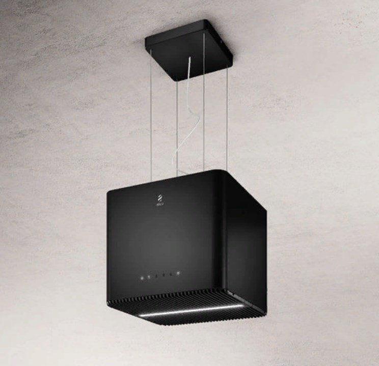 Необычное, но очень эффективное решение от Elica. Вытяжка крепится к потолку, неограничиваясь в выборе места расположения. Прибор работает в режиме циркуляции и не требует подсоединения к вентиляционному каналу. Воздух проходит через угольный фильтр и возвращается обратно. Пользователю лишь необходимо следить за степенью насыщения и вовремя менять расходный материал для дальнейшей качественной работы. Подобную конструкцию нередко используют над кухонными островами. Модель смотрится компактно и красиво, не только не нарушит дизайн кухни, но и дополнит его.