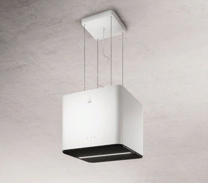 Подвесная конструкция — разновидность островной, она также крепится к потолку над изолированной варочной поверхностью. Ее особенность — тросы, на которых держится основание. Благодаря этому вытяжка кажется невесомой, зачастую напоминает светильник и отлично вписывается в интерьер.