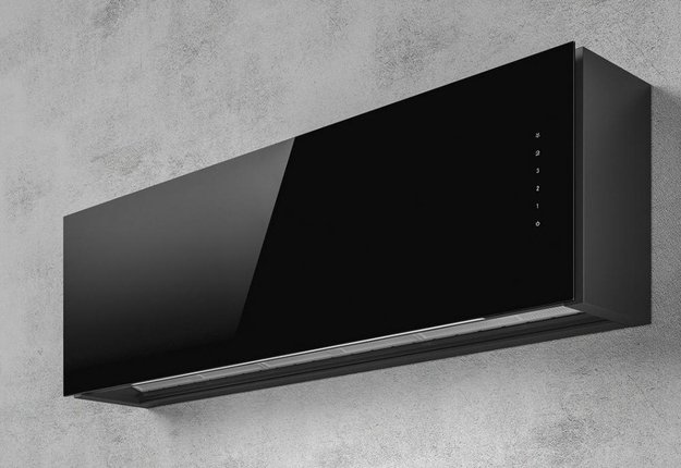 Нестандартная форма вытяжки смотрится эффектно в любом интерьерном решении. Черная поверхность обеспечивает широкий спектр цветового сочетания, что расширяет возможности при планировании дизайна. Ширина модели составляет 120 см, что подходит для варочных панелей или плит с пятью конфорками. Производителем предусмотрено три скорости и интенсивный режим для сложных ситуаций. За безопасную эксплуатацию устройства отвечают алюминиевые фильтры. Воздух проходит через специальные сетки, в которых задерживаются грубые частицы, например, жир. Таким образом, двигатель надежно защищен от налипания грязи, тем самым повышая эффективность работы и срок службы устройства.