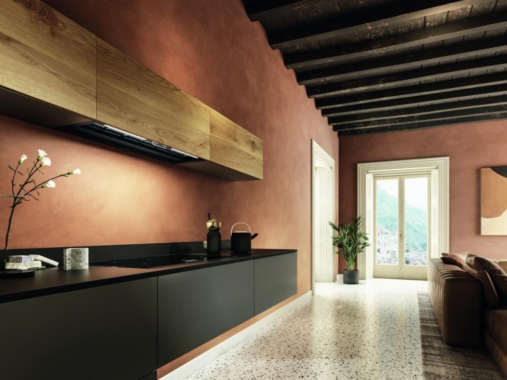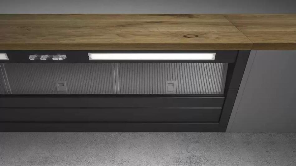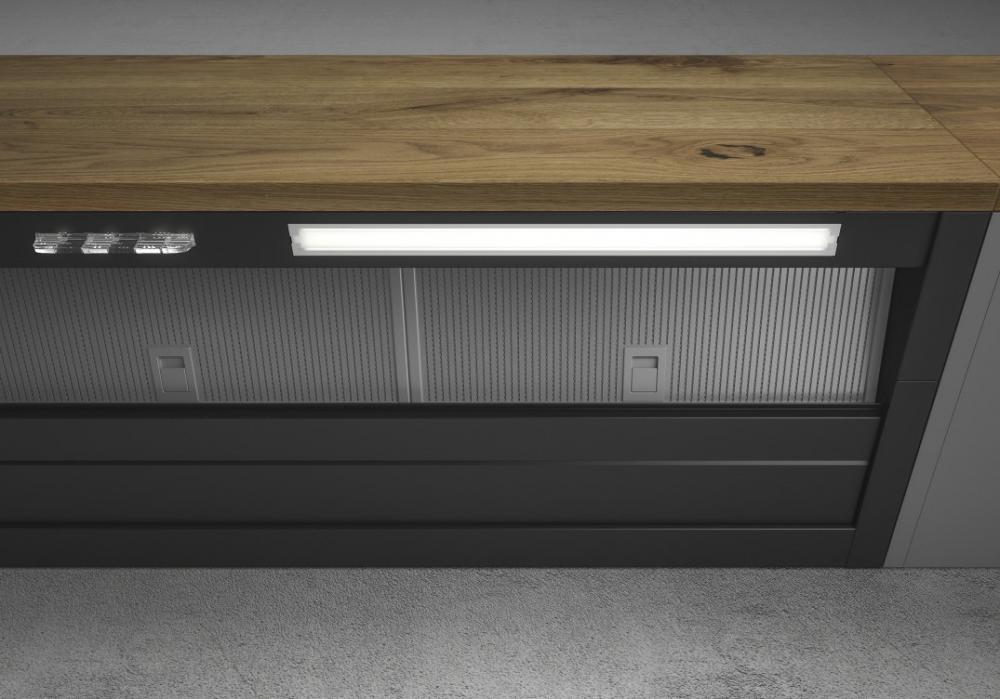 Вытяжки, встраиваемые в столешницу — эффективная инновация, которая подойдет для установки в кухне любой площади. Такие вытяжки размещаются за варочной поверхностью или рядом с ней. В отключенном состоянии всасывающая панель находится под столешницей, но после включения одной или нескольких конфорок она автоматически выдвигается при помощи специального лифтового механизма. Загрязненный воздух улавливается, не успевая распространиться по помещению. Когда вытяжка убрана, на виду остается только сенсорная панель управления. Недостатком подобных моделей является только сравнительно высокая цена.