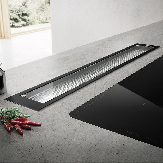 Вытяжки, встраиваемые в столешницу — эффективная инновация, которая подойдет для установки в кухне любой площади. Такие вытяжки размещаются за варочной поверхностью или рядом с ней. В отключенном состоянии всасывающая панель находится под столешницей, но после включения одной или нескольких конфорок она автоматически выдвигается при помощи специального лифтового механизма. Загрязненный воздух улавливается, не успевая распространиться по помещению. Когда вытяжка убрана, на виду остается только сенсорная панель управления. Недостатком подобных моделей является только сравнительно высокая цена.