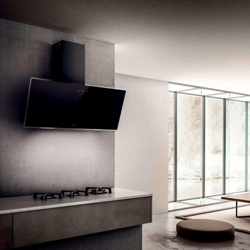 Настенная вытяжка с широкой фронтальной панелью в лаконичном дизайне Fabrizio Grisa, в цвете «черное стекло». Основный режим работы — отвод загрязненного воздуха в воздуховод, благодаря алюминиевому фильтру эффективно удаляются как крупные, так и мелкие частицы пищи, водяной пар, сильные запахи не распространяются по квартире. Чтобы использовать очищенный воздух повторно — то есть использовать вытяжку в режиме рециркуляции — необходимо дополнительно приобрести угольный фильтр.