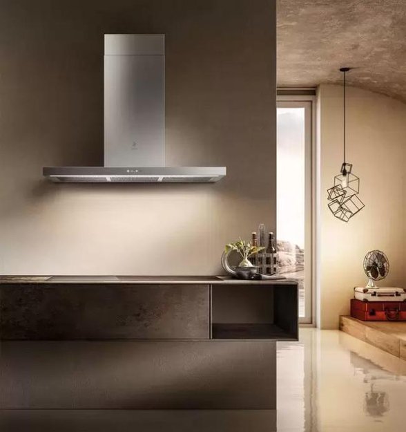 Т-образный дизайн распространен среди производителей премиальных и бюджетных вытяжек. Его легко реализовать, такая модель впишется в большинство кухонь и гарантировано покроет все рабочее пространство над варочной панелью. Часто выполняется из нержавеющей стали и используется в лофтах, также есть варианты с фронтальной панелью из стекла.