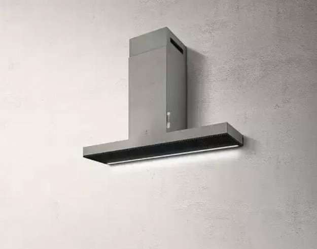Т-образный дизайн распространен среди производителей премиальных и бюджетных вытяжек. Его легко реализовать, такая модель впишется в большинство кухонь и гарантировано покроет все рабочее пространство над варочной панелью. Часто выполняется из нержавеющей стали и используется в лофтах, также есть варианты с фронтальной панелью из стекла.