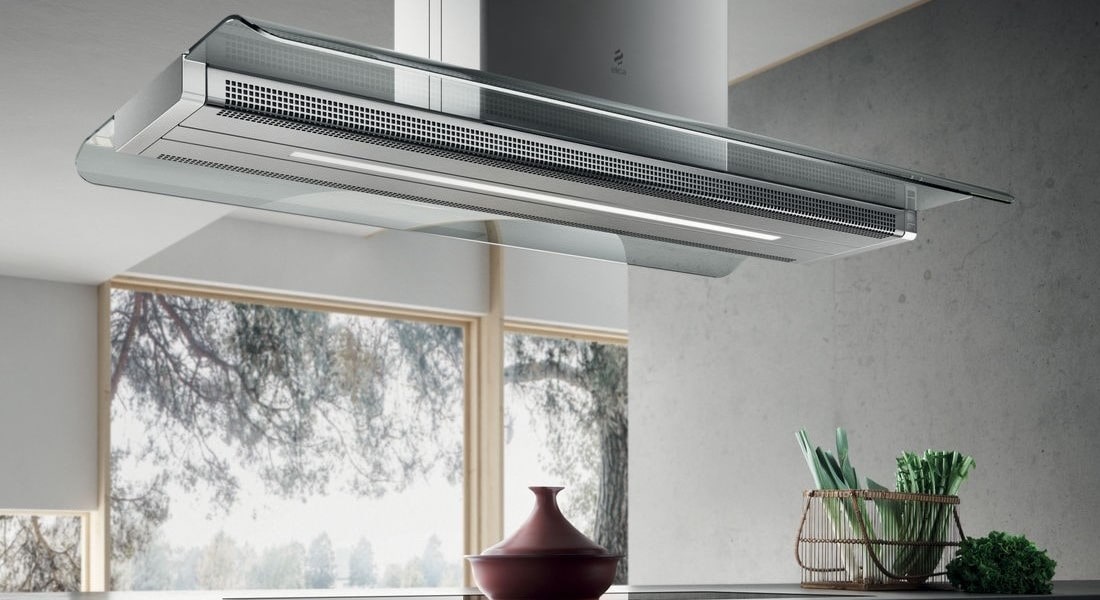 Подвесные вытяжки работают на рециркуляцию — воздух внутри очищается от примесей угольными фильтрами и выводится обратно в комнату. Они прекрасно вписываются в сложные дизайнерские интерьеры, выглядят воздушными и невесомыми за счет тонких креплений.
