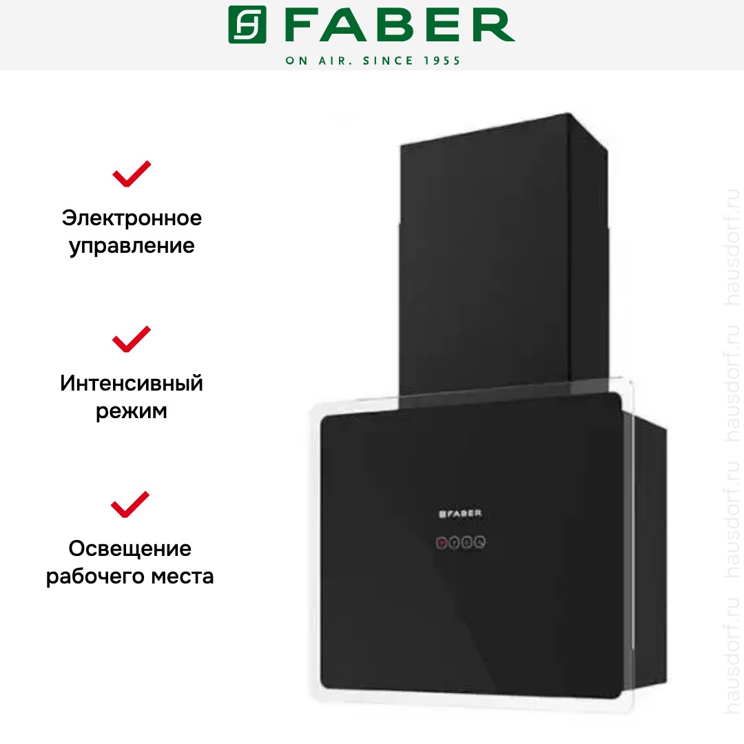 Вытяжка от Faber в черном исполнении отличается стильным и лаконичным дизайном, а также высокими результатами очистки. Панель управления располагается на фасаде устройства. Преимуществом устройства является начало работы с одного нажатия. Специальные графические обозначения у кнопок позволяют быстро сориентироваться в настройках. Установленный мотор может работать на трех скоростях. Возможность активации интенсивной ступени является дополнительным преимуществом. Вытяжка может работать без подсоединения к вентиляции — в режиме циркуляции. Встроенная подсветка создает комфортные условия для приготовления.