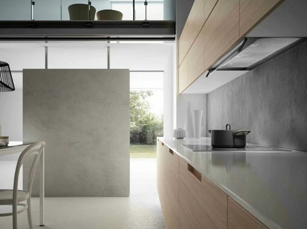 Вытяжка устанавливается в шкаф или в потолочную нишу — таким образом все соединительные элементы и корпус оказываются скрыты. Это подходящий вариант для небольшого помещения, если нужно максимально освободить пространство, а также необходимость, если вы продумываете кухонный дизайн до мелочей.