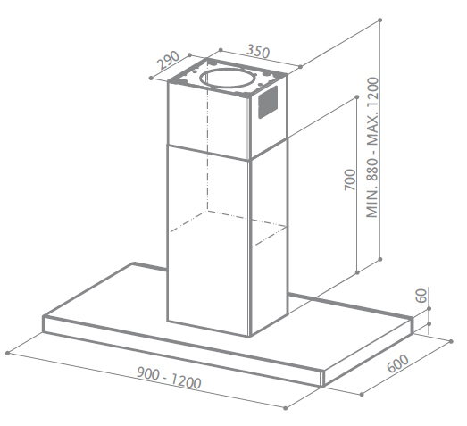 Для удобства пользователя следует выбирать вытяжку так, чтобы глубина даже самого большого купола не превышала глубину столешницы. У большинства современных купольных моделей глубина точно равна ширине, поскольку и стандартные варочные поверхности чаще всего имеют квадратную форму. Это значит, что вытяжка должна располагаться точно над поверхностью плиты, так, чтобы их оси совпадали. Стандартные размеры глубины таким образом могут составлять 30, 45, 50, 60, 80, 90, 100, 120 см.