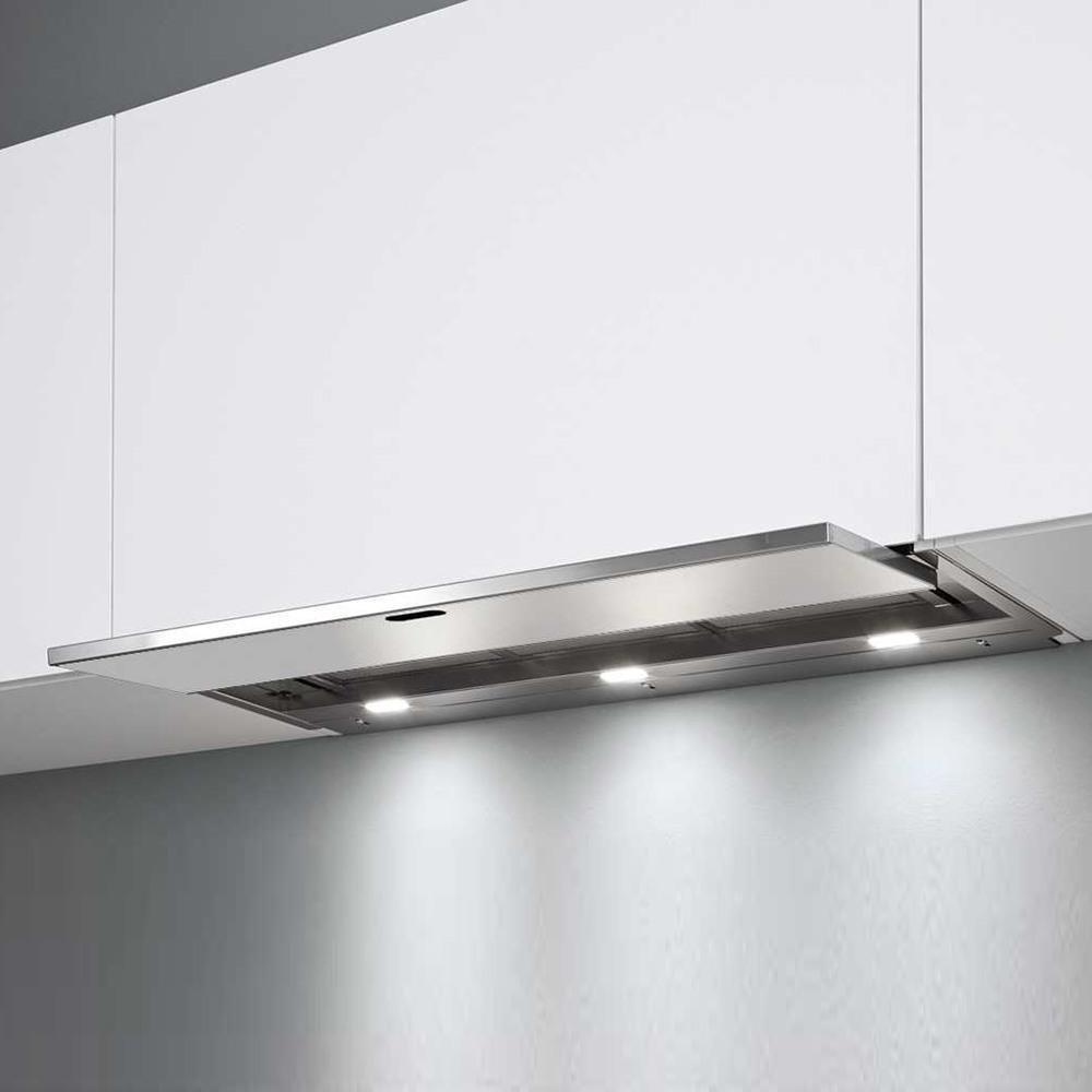 Встраивание вытяжки в шкаф — оптимальный вариант для малогабаритной кухни. Такие модели просты в установке, недороги, практически скрыты от глаз, их не нужно подбирать по внешнему виду, а также чем-то маскировать воздуховод. Уровень шума также снижается благодаря дополнительной звукоизоляции. Встроенные в шкаф модели могут дополняться выдвижной панелью, которая увеличивает площадь забора загрязненного воздуха. Иногда к встраиваемым относят также вытяжки, которые монтируются под подвесной шкаф, хотя их корпус остается на виду.