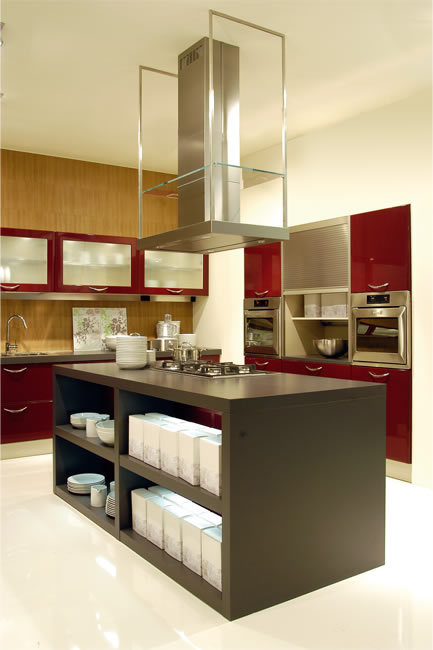 Островные модели устанавливаются на потолок над кухонным островом, которым часто оснащаются просторные кухни-столовые в современных квартирах. Подключение таких приборов к вентиляции требует больших трудозатрат, так что часть из них работает только в режиме рециркуляции. Для работы в режиме отвода воздуховод должен располагаться вертикально, что позволяет создавать оригинальные конструкции, которые станут заметной деталью в любой кухне.