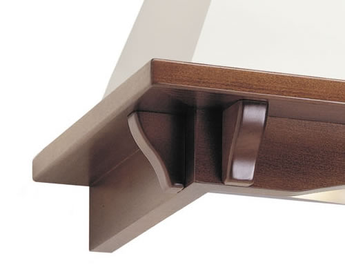 Особенно разнообразен ассортимент классических вытяжек с окантовкой из натурального дерева. Корпус таких моделей выполняется в спокойном белом или бежевом цвете, хорошо сочетающемся с оттенками натурального дерева — мореного дуба, бука, вишни или ореха. Нередко для окантовки используется окрашенное дерево в тон с цветом купола: особенно популярны оттенки ванили, бежевый и кремовый. Иногда дерево специально оставляют неокрашенным, чтобы пользователь мог подобрать оттенок самостоятельно.