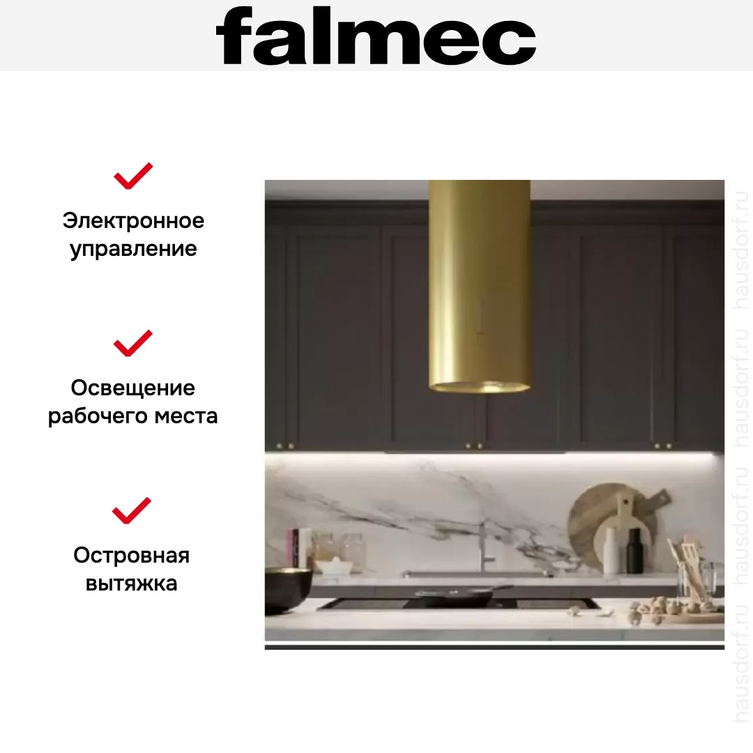 Островная вытяжка Falmec Polar IS GOLD 35 может быть установлена в любом удобном для вас месте, специальных требований нет. Необычная форма и золотой цвет отлично впишется в современный стиль кухни. Корпус выполнен из нержавеющей стали.