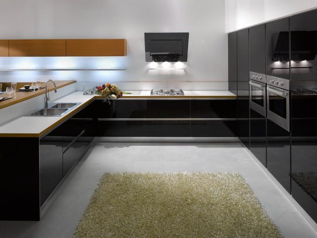Самыми популярными остаются черные вытяжки. Черный цвет отлично сочетается с любыми другими, на нем не так заметны загрязнения. Кроме того, черные тона можно вписать в кухню любого стиля, от хай-тек до классического. В черном цвете изготавливают все типы вытяжек — купольные, наклонные, настенные, подвесные, островные, Т-образные. Особенно интересны и разнообразны модели из закаленного стекла, которое удачно гармонирует со стеклокерамическими варочными панелями.
