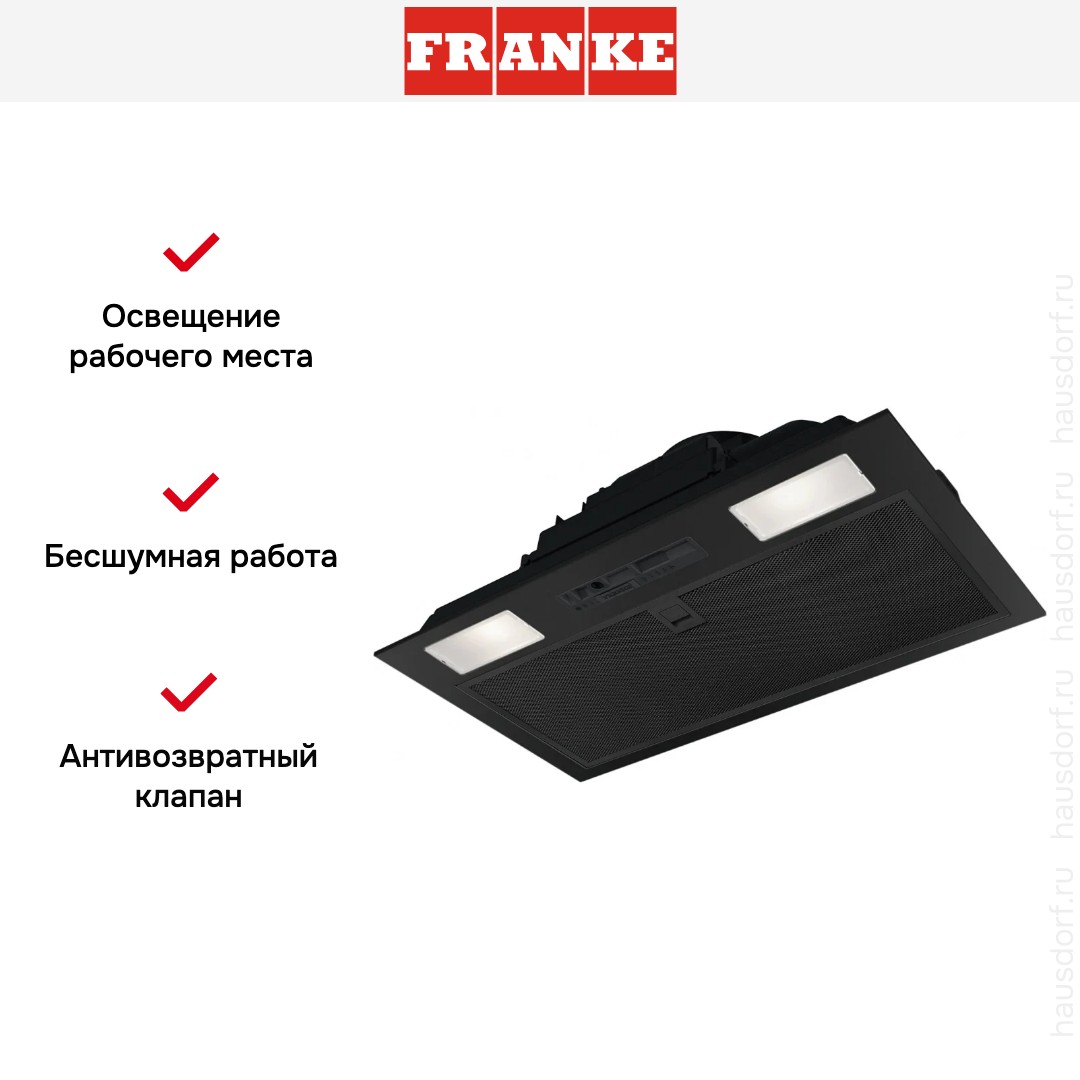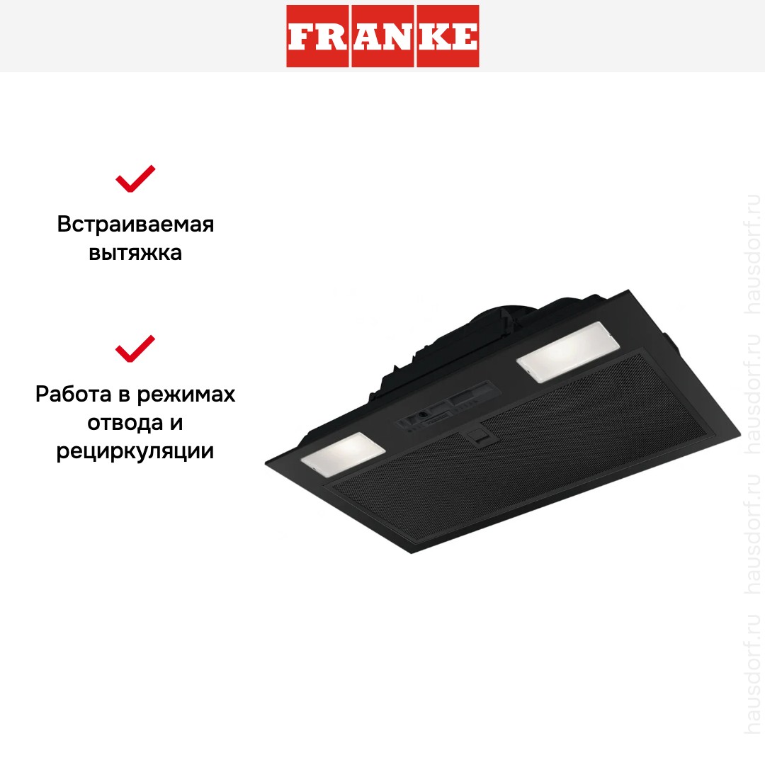 Встраиваемая вытяжка Franke FBI 525 BK — компактное и функциональное решение для современной кухни, разработанное с акцентом на эффективность, эстетику и удобство монтажа. Модель предназначена для встраивания в навесной шкаф, что позволяет сохранить гармонию интерьера и избежать визуального перегруза. Её габариты — всего 17,4 см в высоту, 52,2 см в ширину и 28,6 см в глубину — делают устройство одним из самых низкопрофильных в своём классе, идеально подходящим для кухонь с ограниченным пространством над варочной поверхностью.