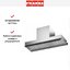 Выглядит как встроенный прибор с лаконичной фронтальной панелью: корпус из нержавеющей стали сочетается с декоративной вставкой из черного стекла, образуя спокойную, но выразительную поверхность. Габариты 34×90×32 см делают модель подходящей для установки в шкаф над плитой, оставляя достаточно места для воздуховода диаметром 150 мм. Боковое расположение кнопочных органов управления удобно при монтировании и не нарушает линий фасада.