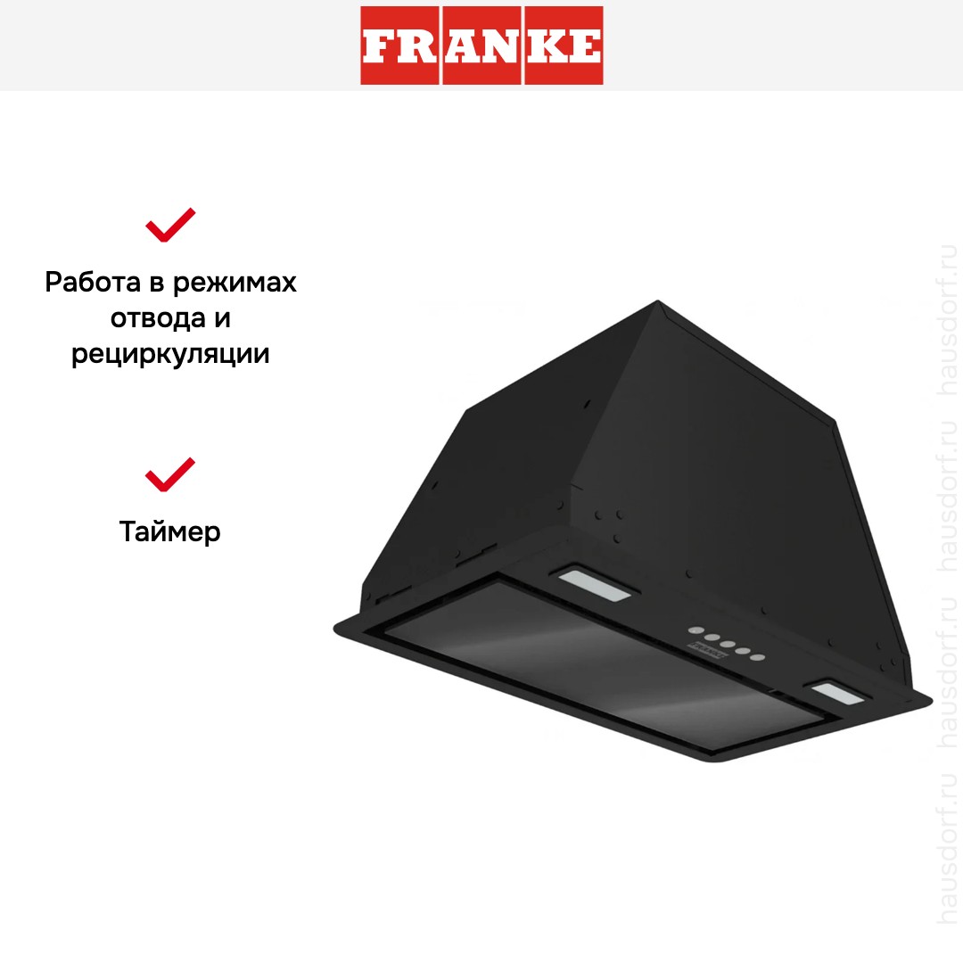 Встраиваемая вытяжка — выбор тех, кто хочет максимально задекорировать технику, или владельцев маленькой кухни. Тип встраивания: в шкаф. Обратите внимание на цветовые сочетания модели Franke VERA 52 BK, чтобы органично вписать ее в свою квартиру. Оттенок корпуса: черный. Благодаря лампочкам, которые расположены на нем, можно освещать плиту и столешницу рядом, чтобы готовить было еще проще и приятнее.