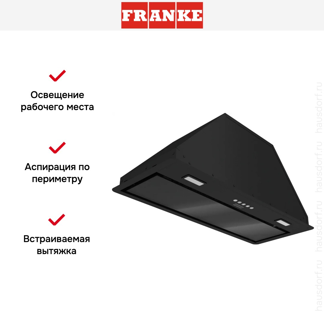 Встраиваемая вытяжка — выбор тех, кто хочет максимально задекорировать технику, или владельцев маленькой кухни. Тип встраивания: в шкаф. Обратите внимание на цветовые сочетания модели Franke VERA 72 BK, чтобы органично вписать ее в свою квартиру. Оттенок корпуса: черный. Благодаря лампочкам, которые расположены на нем, можно освещать плиту и столешницу рядом, чтобы готовить было еще проще и приятнее.