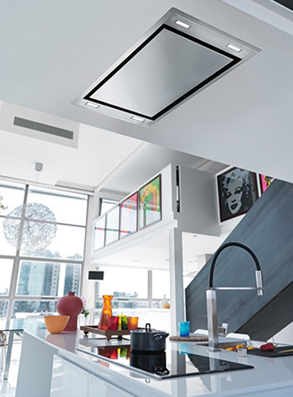 Вытяжка, встраиваемая в потолок, часто устанавливается над кухонным островом в просторной кухне и отличается достаточно высокой мощностью: она может работать как в режиме рециркуляции, так и в режиме отвода, так как воздуховод также скрыт в потолке. Вытяжки могут монтироваться в подвесной потолок либо устанавливаться в специальные многоярусные конструкции из гипсокартона непосредственно во время ремонта кухни. Для управления ими используется пульт ДУ.
