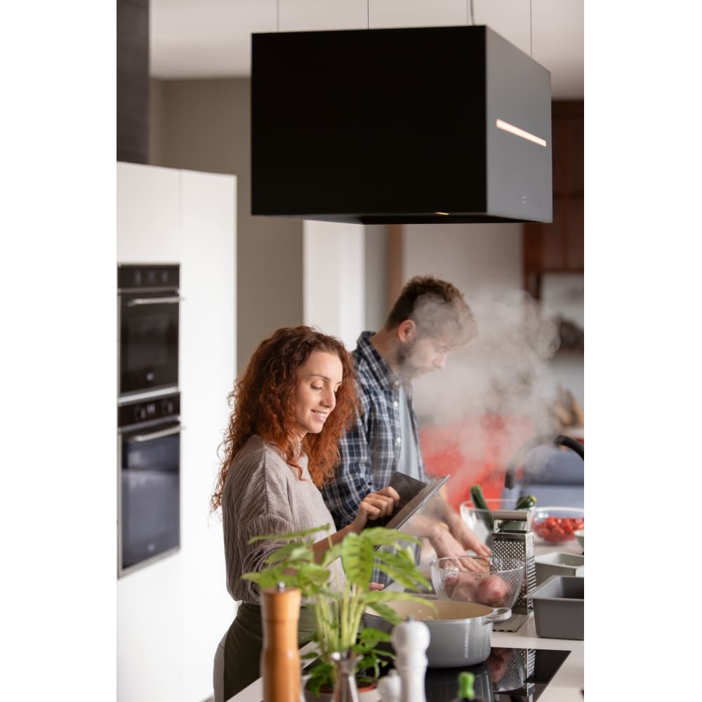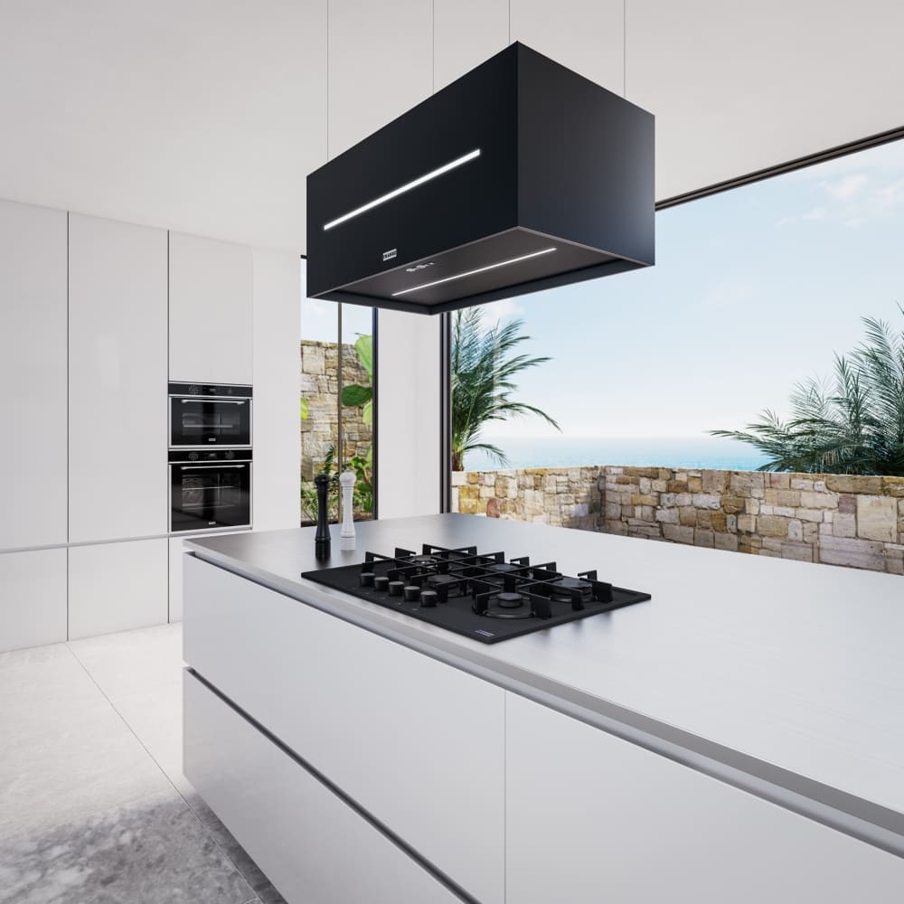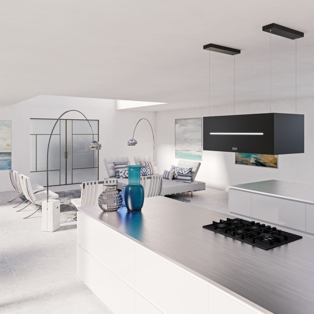 Островные модели устанавливаются на потолок над кухонным островом, которым часто оснащаются просторные кухни-столовые в современных квартирах. Подключение таких приборов к вентиляции требует больших трудозатрат, так что часть из них работает только в режиме рециркуляции. Для работы в режиме отвода воздуховод должен располагаться вертикально, что позволяет создавать оригинальные конструкции, которые станут заметной деталью в любой кухне.