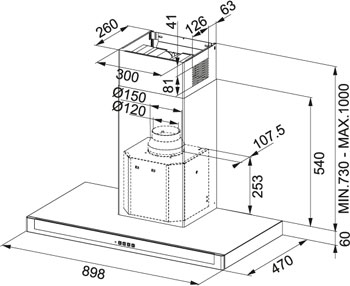 Для удобства пользователя следует выбирать вытяжку так, чтобы глубина даже самого большого купола не превышала глубину столешницы. У большинства современных купольных моделей глубина точно равна ширине, поскольку и стандартные варочные поверхности чаще всего имеют квадратную форму. Это значит, что вытяжка должна располагаться точно над поверхностью плиты, так, чтобы их оси совпадали. Стандартные размеры глубины таким образом могут составлять 30, 45, 50, 60, 80, 90, 100, 120 см.